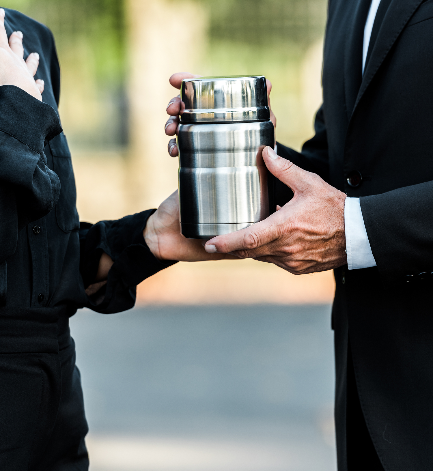 The remains are securely placed in a heavy-duty sealed bag, then placed in the selected urn.